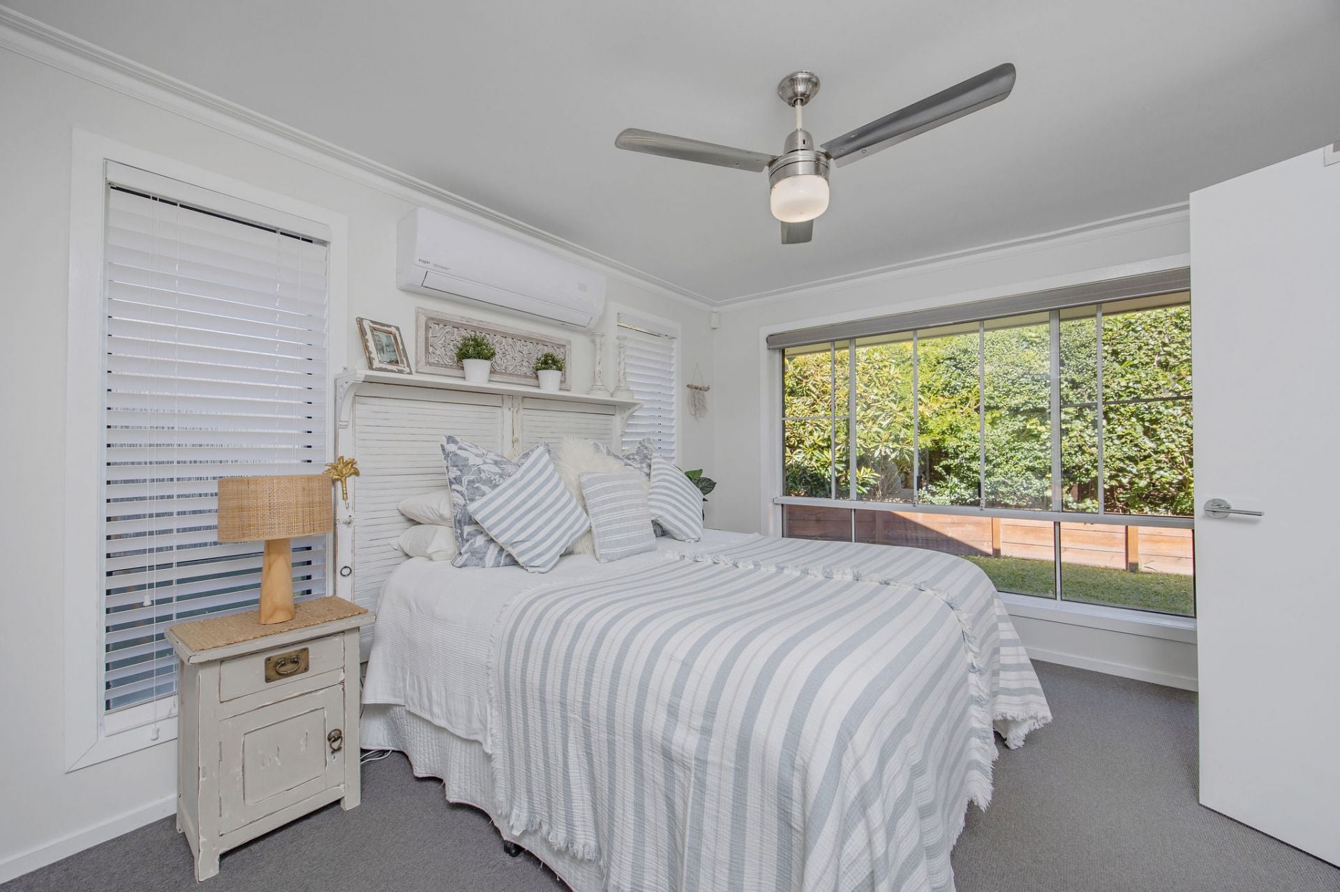 Fully fenced yard with easy-care gardens and a thick privacy hedge
