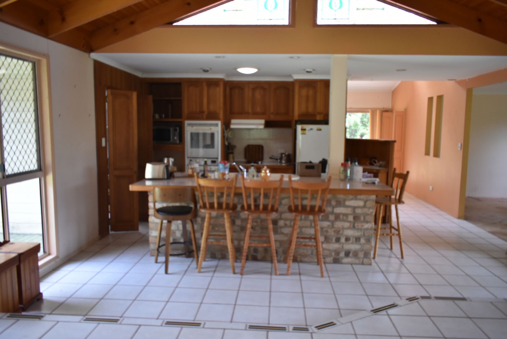 Exposed timber ceilings and stained-glass windows.