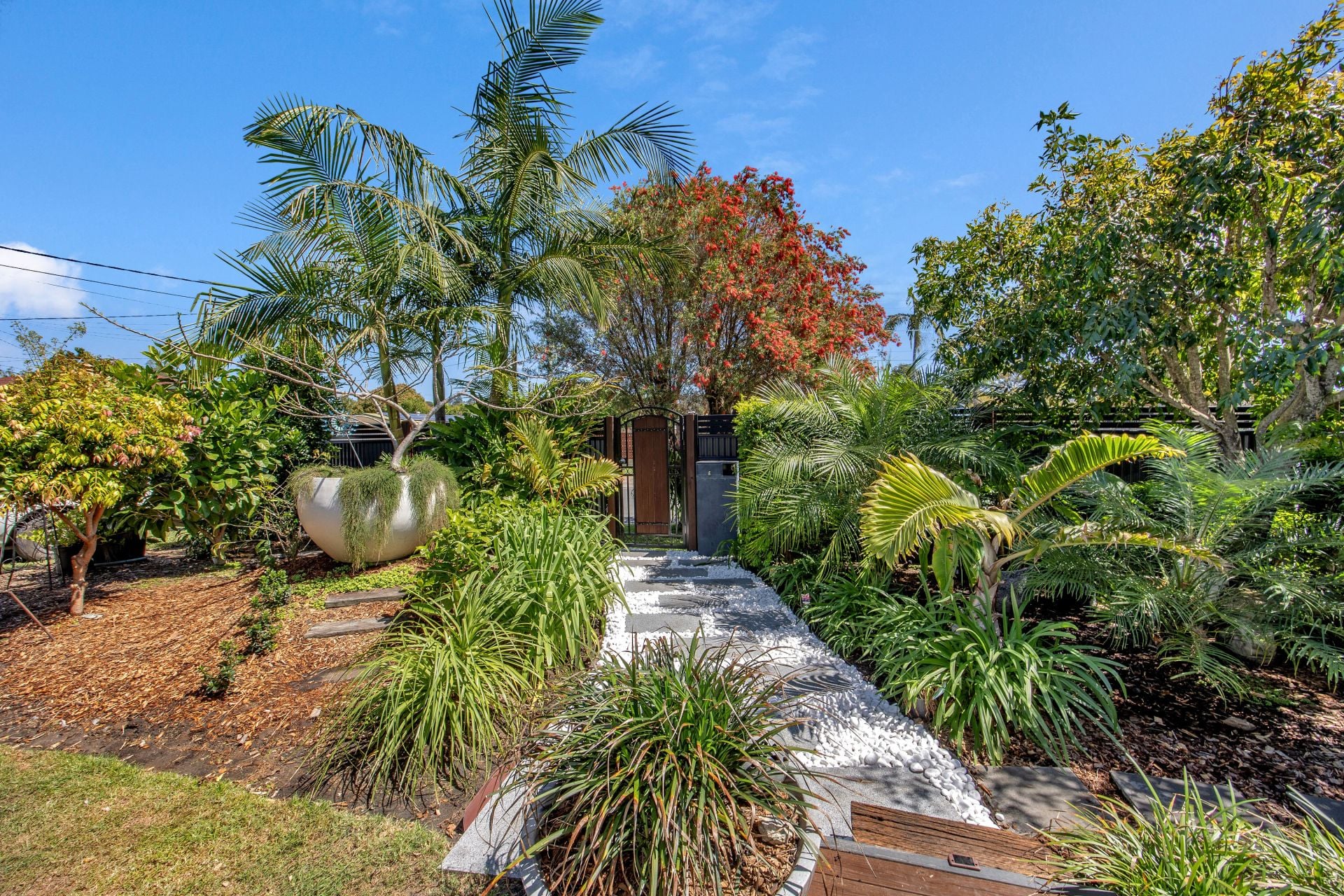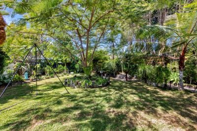 Walk through the secure gate and over the glistening white stones and granite pavers to a timber deck a place you can sit and enjoy a morning coffee whilst taking in the gorgeous front garden. A screened alcove leads to the front door opening into the spacious lounge dining and kitchen area this property is an entertainers dream with a large island bench where you can be creating gourmet delights whilst having your guests sit at the dining table or enjoying a drink in the lounge. Glass doors open out onto an alfresco covered deck making this ideal for indoor/outdoor get togethers all year round, overlooking the structured back garden includes all manner of fruit trees and interesting pathways with all types of curious plants and shrubs this truly is a gardeners dream, want to sit outside during winter with a fire? this is catered for with a sheltered seated area hidden away in the back corner of the garden put up a hammock and while away the evening in front of the fire with a glass of wine you could forget where you are.